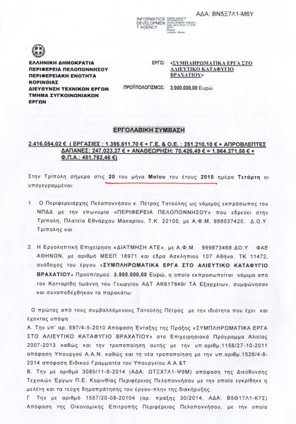 Σύμφωνα λοιπόν με την εργολαβική σύμβαση που φέρνουμε σήμερα στο φως, στις 20 Μαΐου στην Τρίπολη ο περιφερειάρχης Πελοποννήσου Πέτρος Τατούλης και ο 48χρονος εκπρόσωπος της ΔΙΑΤΜΗΣΗ ΑΤΕ Γιάννης Κοτταρίδης συνυπέγραψαν τη συμφωνία για την ανάληψη εκ μέρους της κατασκευαστικής εταιρείας των συμπληρωματικών έργων στο αλιευτικό καταφύγιο Βραχατίου που εντάσσεται στο Επιχειρησιακό Πρόγραμμα Αλιείας 2007 – 2013.