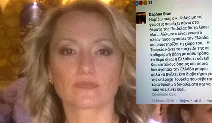 Η εν λόγω δασκάλα στην δήλωση της στο FB χρησιμοποίησε την φράση ¨Η Τουρκία κάνει το παιχνίδι της σε καθημερινή βάση. Το θέμα είναι η Ελλάδα τι κάνει; Και επιτέλους όποιος δεν αγαπάει την Ελλάδα μπορεί να βγάλει διαβατήριο, για την υπέροχη Τουρκία που σέβεται τα ανθρώπινα δικαιώματα και να μείνει εκεί¨.