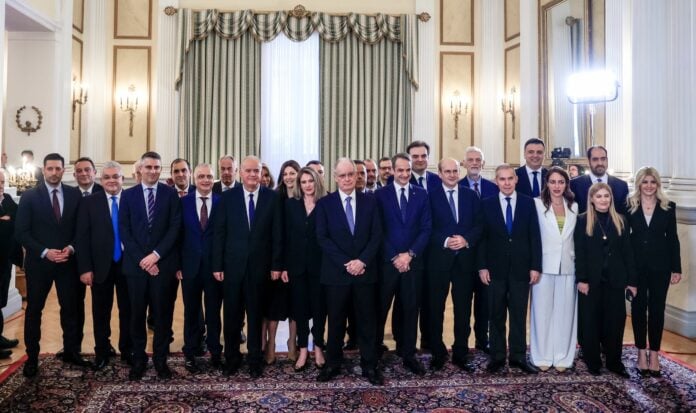 στο Προεδρικό Μέγαρο τα 61 μέλη της ανασχηματισμένης Κυβέρνησης Μητσοτάκη, η οποία μπορεί να έχει πλέον νέα σύνθεση (ας πούμε…), αλλά είναι… αποφασισμένη να συνεχίσει με την παλιά «καλή» συνταγή της διάλυσης των πάντων.