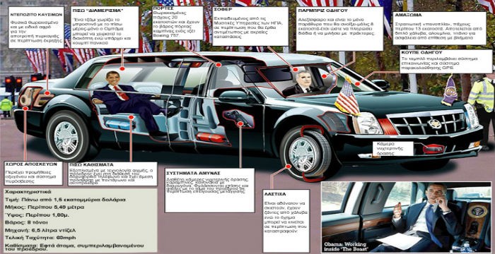 Ο πλανητάρχης κυκλοφορεί με ένα τέρας! Και όχι, δεν εννοούμε τη λατρεμένη του σύζυγο, Μισέλ αλλά μια άλλη «κούκλα». Ο Ομπάμα κυκλοφορεί με το απίστευτα θωρακισμένο όχημά του που δε φέρει τυχαία το τίτλο «The beast», δηλαδή το «τέρας», μιας και καμία βόμβα-σχεδόν-, δεν μπορεί να το τσαλακώσει.