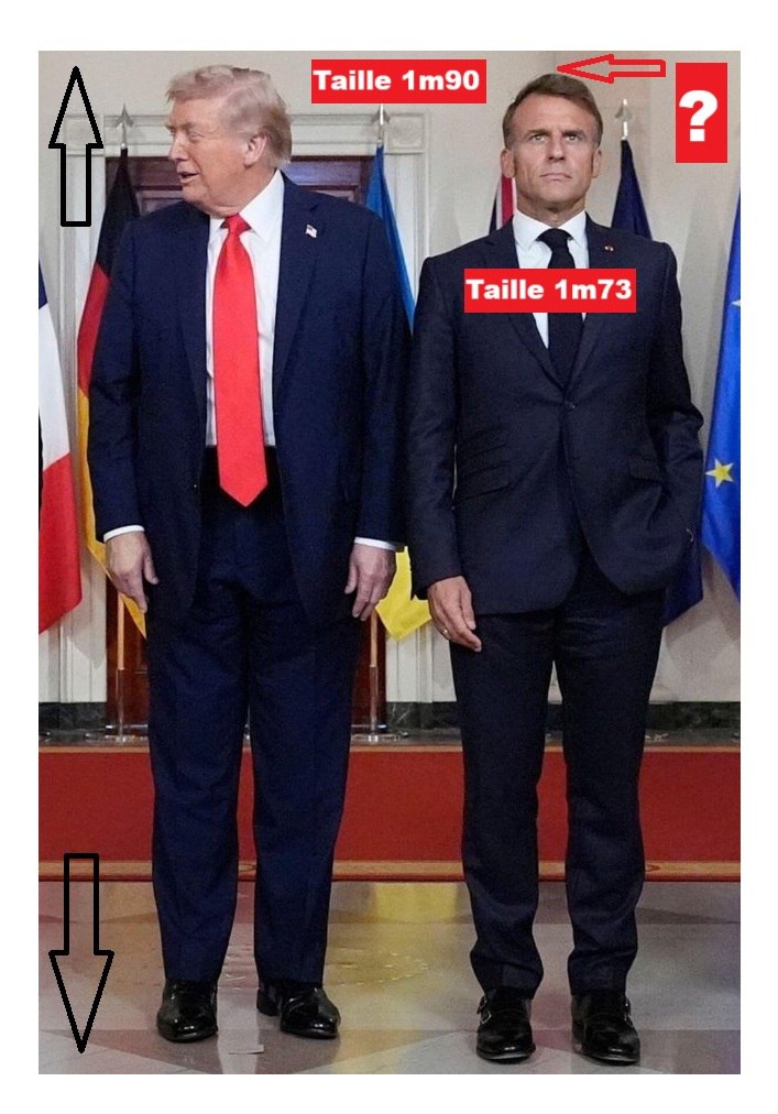 Αν αυτό υλοποιηθεί, θα αλλάξει πραγματικά τα δεδομένα, διότι αυτή τη στιγμή ο Ζαν Μισέλ ντε Ρότσιλντ, που παριστάνει την Μπριζίτ Μακρόν, ελέγχει τις κυβερνήσεις του Ηνωμένου Βασιλείου, του Καναδά, της Γαλλίας, της Γερμανίας και τον ψεύτικο κοντό και χοντρό Τραμπ που παριστάνει τώρα τον Πρόεδρο των ΗΠΑ (δεν πρέπει να συγχέεται με τον πραγματικό Τραμπ ύψους 190 εκατοστών). Ενδεικτικά, εδώ είναι μια φωτογραφία του ψεύτικου Τραμπ να συναντά την Εμανουέλ Μακρόν, όπου μπορείτε να δείτε ότι είναι μόλις και μετά βίας ψηλότερος από την 173 εκατοστών ψηλή Μακρόν.
